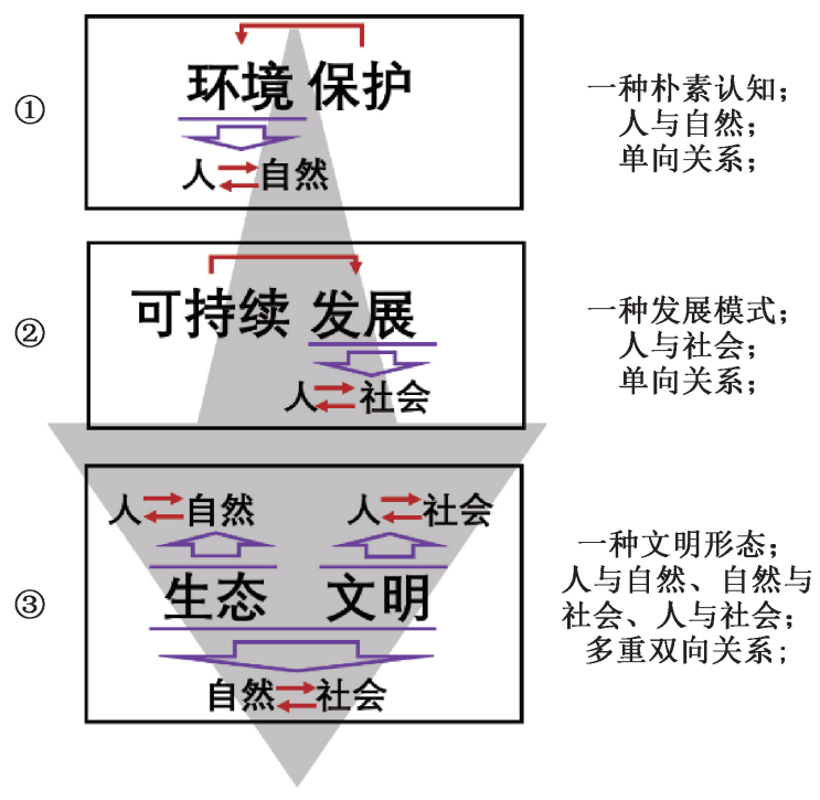 “生態文明”的概念,描述的則是一種歷史上未曾出現過的文明形態。它提出以“人與自然、自然與社會、人與社會和諧共生、良性循環、全面發展、持續繁榮”為基本宗旨的社會形態。它的內涵包括而又超越之前的認識,“生態”兩字反映著人與自然的關系,保護自然同時享用自然;“文明”兩字反映著人與自然、社會之間的關系,人類要敬畏自然,個人服從社會,同時社會支撐個人的發展;“生態”與“文明”銜接,反映著自然與社會之間的關系,自然以資源的方式為社會提供物質基礎,社會以科技的方式尊重自然。“生態文明”概念,蘊含多重雙向關系,超越了狹義的“環境保護”以及“可持續發展”,在關注“人與自然”關系的傳統觀念基礎上,增加了對“自然與社會”和“人與社會”之間和諧關系的強調,是對環境保護概念的一次創造性升級深化,為人類文明的走向提供了一種超越“工業文明”的新形態,即,這是一種“生態”的“文明”,這種“文明”以文明的方式對待“生態”。