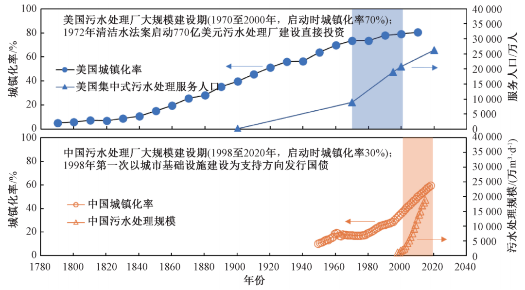 快速城鎮化導致的污水處理廠與周邊社區之間的矛盾關系,是我國污水處理行業面臨的特色問題,與我國快速城鎮化的歷史背景相關。從2000年到2020年,我國只用了20年的時間完成了城鎮化率從30%提升到60%的目標。因此可以說,污水處理廠的建設幾乎跟城市的發展建設同步進行,或者說,城市的建設速度超過了規劃速度,導致大量早期建設的污水廠被城市建設所包圍。相比之下,美國及歐洲從上個世紀初就開始了城鎮化進程,比我國早了近兩百年,用了近70年的時間完成城鎮化率從30%的60%的發展階段,西方國家的污水處理廠是在其城鎮化后期,水污染問題出現后才開始規劃建設。因此,我國污水處理廠與城市發展矛盾的出現具有一定國情特色,從而也需要符合中國的創新解決方案。