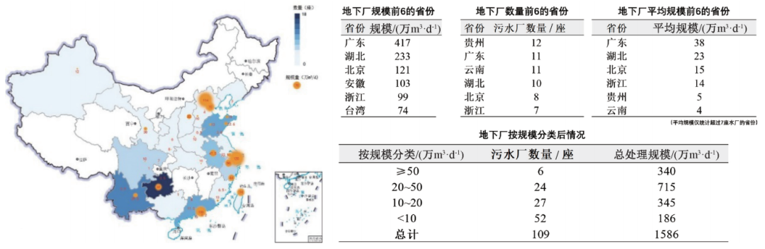 客觀上,我國地下污水處理廠建設呈現逐年增長的趨勢,發展十分迅速。據不完全統計,截至2020年底,我國地下污水處理廠數量達到109座,總處理規模1 586萬m3/d,其中半數地下廠規模超過10萬m3/d,近半數污水由20萬~50萬m3/d區間規模的大型地下廠處理,為全世界地下廠數量最多的國家。具體來說,我國地下污水處理廠分布具有明顯的地區集中性特點,主要分布于環渤海、長三角和珠三角等經濟發達地區,以及地貌較復雜的云貴川區域。如圖3所示,以污水處理規模計,地下廠規模最大的省份分別為廣東、湖北和北京,日處理規模均超過百萬立方米,其中廣東省規模居首,達到417萬m3/d。以數量計,擁有最多地下廠數量的省份分別為貴州、廣東和云南,均達到10座以上。不同地域的地下污水處理廠,其污水處理規模具有顯著差異,云、貴兩省的地下廠規模相對較小,平均規模4萬~5萬m3/d;而北京、浙江的地下廠平均規模相對較大,達到14萬~15萬m3/d;而廣東、湖北地下廠平均規模較大,分別為23萬m3/d、38萬m3/d。地下污水處理廠已經成為“十四五”期間市政污水處理行業的新增長點。