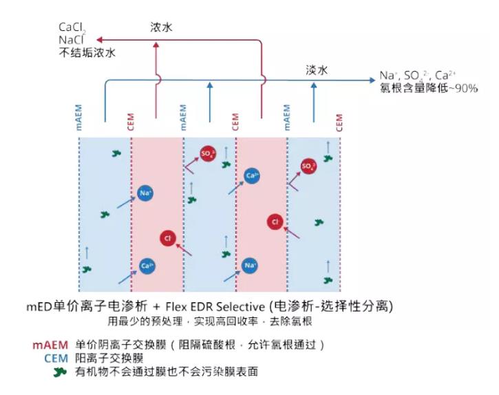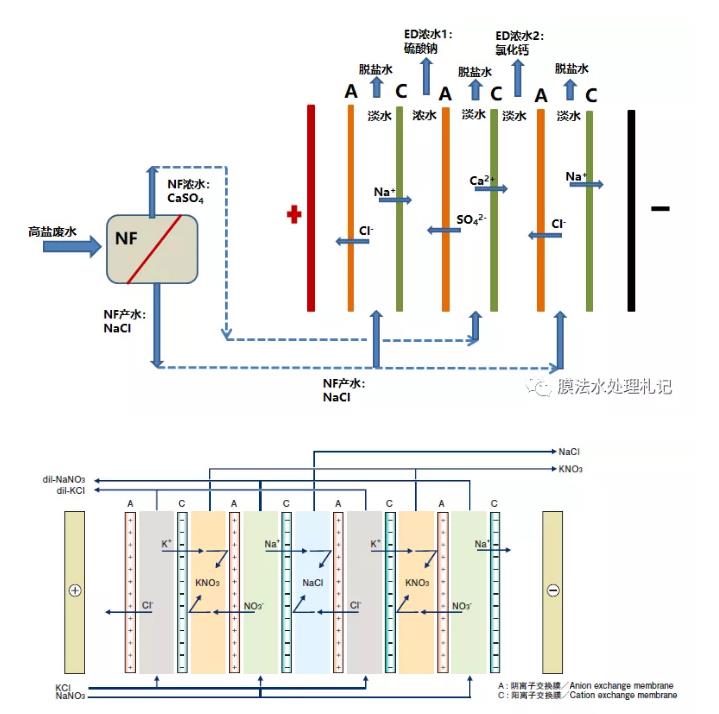 nf-ed的聯用工藝可以算一個思路,工藝可行性沒有問題,它其實是置換電滲析(第二張圖)的延伸應用。這種工藝在廢水處理需求中落地性會受限于多種因素,如廢水組成、濃水溶液的純度、脫鹽水的處理等。