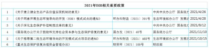 2021年,從政策層面的進(jìn)一步明確到試點(diǎn)推進(jìn)的不斷加深,eod模式落地加速。根據(jù)環(huán)境商會(huì)觀察,一是2021年全年,相關(guān)政策陸續(xù)發(fā)布,對eod的支持力度加大。